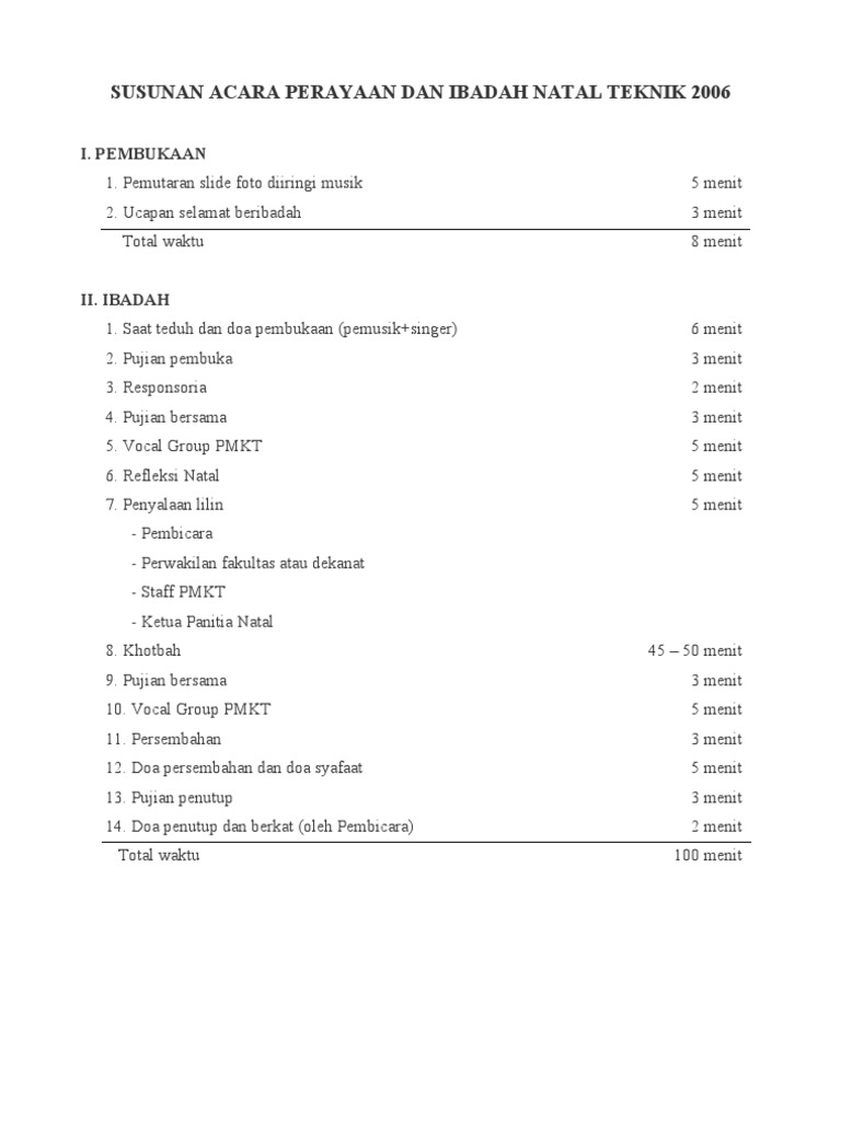 2.diminimalisir suara suara yang mengganggu penyampaian khotbah ( pada awal khotbah layar lcd menayangkan running text supaya hp di silent atau off ) 3.usher berhak untuk meminta orang tua jemaat untuk memperhatikan. Ajak dan libatkan seluruh guru sekolah minggu untuk terlibat dalam merencanakan dan. Contoh susunan acara natal pemuda. Lampiran bisa dicantumkan jika memang perlu menyampaikan rundown acara. Materi ini bisa disampaikan di natal sd ataupun di natal sekolah minggu.